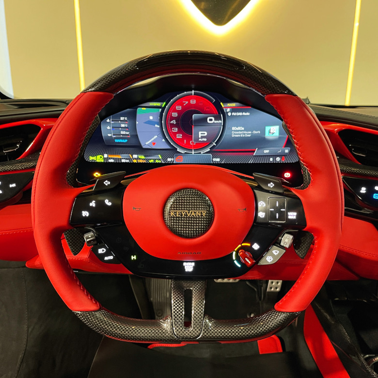 The Keyvany edition of the SF90 interior has undergone a complete revolution. Tailored to the customer's strict specifications, the interior is covered in high-quality leather decorated with quilting and embroidery and complemented with carbon fibre add-ons.